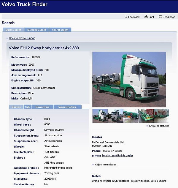 幫你找二手重車!VOLVO二手重車資訊網歐洲開通! CVNews 商業車誌: 陳昱先|03/22/2007 新版本的VOLVO Truck Finder服務日前正式上線! 對於許多有二手重車需求的歐洲企業來說,除了藉由一般二手車通路與零星的網路媒體作為資訊尋找的來源外,想要尋求更完整齊全的二手重卡訊息,可說是障礙重重;有鑑於此,VOLVO Truck將之前附掛於網站中的二手重車資訊搜尋系統予以強化,正式更名為VOLVO Truck Finder,提供更完整的二手重車資訊給消費者。 歐洲地區的消費者,可透過簡單的網路搜尋獲得詳細的VOLVO二手重卡資訊。 二手車的網路購車趨勢 在歐洲地區,購車習慣隨著網路資訊的高度發展,呈現出網路化的趨勢,而習於滿足客戶需求的VOLVO Truck也因應這股潮流,成立擁有更簡易、強大搜尋功能的VOLVO Truck Finder網站,提供更豐富的資訊給有二手車需求的繁忙卡車物流事業。 經銷商大串連 VOLVO Truck Finder將歐洲、澳洲等23個國家、300家經銷商作串連,為使用者整合歐洲最完整的VOLVO二手重卡資訊,讓客戶可以藉由所在位置找出離自己最近的二手VOLVO重卡;而在搜尋後呈現的資訊更是完整,除了以車型規格作為分類項目、以及顯示年份、里程數、型號、產地、內裝配備等基本訊息外,還提供清晰的圖片與聯絡方式,更可透過整合評比的方式,選出最適合本身需求的對象,使得原本要找到符合需求二手車的工作,現在只要在指間即可完成! 貼心的提示功能 同時VOLVO Truck Finder也提供類似預定的提示功能,如果使用者在目前的資料庫中找不到符合需求的VOLVO重卡,也可以先將其要求條件建立於VOLVO Truck Finder的資料庫中,當有符合條件的二手重卡出現時,VOLVO Truck Finder便會利用電子郵件、或是SMS手機簡訊通知客戶,讓你在第一時間獲得這個好消息! 目前VOLVO Truck Finder的資料庫中建檔完成的二手重車量已經超過2,000輛,在擴充資訊庫資料比數的同時,每月平均的搜尋次數也超過270,000次,難說VOLVO Truck Finder這項服務,可能將逐漸取代傳統的二手重車通路也說不定? VOLVO Truck Finder提供完整的車輛規格資訊、圖片與聯絡方式。