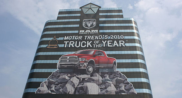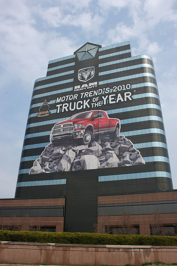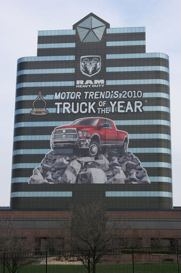 CHRYSLER妝總部,得獎喜悅包不住 CVNews 商業車誌: 王柏偉|04/12/2010 為慶祝Ram重型車輛贏得2010年度風雲卡車獎,CHRYSLER將其位在Auburn Hills的Pentastar企業總部以高42.7公尺、寬36.6公尺的宣傳廣告包裹,將得獎喜訊詔告天下。 Ram重車新成立的部門總裁兼執行長Fred Diaz說道:「包裝總部的動作,主要在和我們的員工與社會大眾分享Ram重車得獎的喜悅,這項展示,估計將在75州際公路上吸引超過20萬駕駛與路人的目光。」 CHRYSLER公司表示,這次的大樓包裝,只是近期Ram重車全球發表行銷活動的一部分。想當然獲獎後的Ram重車,定能大張旗鼓地打著這張金字招牌,吸引更高的買氣。