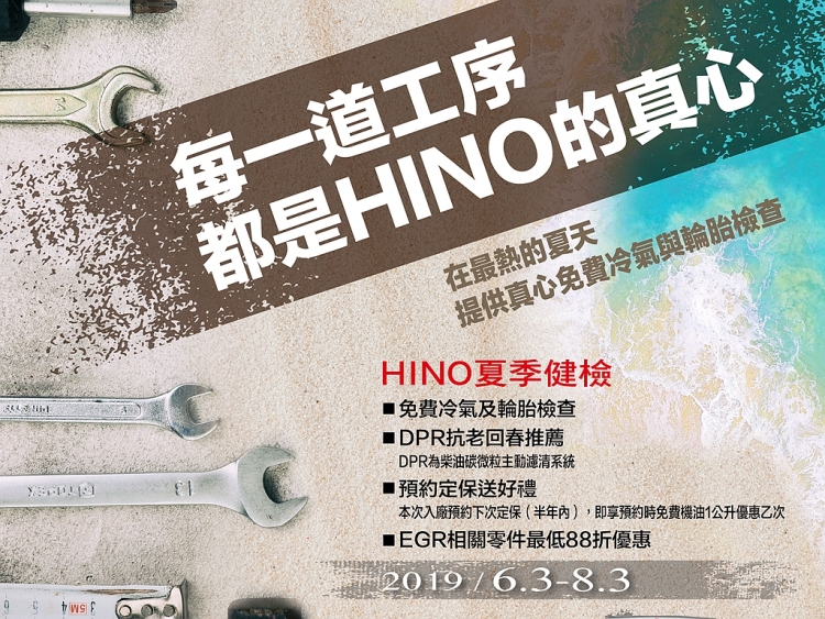真心照顧頭家們的愛車,HINO夏季健檢活動即日啟動 CVNews 商業車誌: 編輯組|06/04/2019 HINO商用車台灣總代理和泰汽車自2019年6月3日起至2019年8月3日止,舉辦「每一道工序 都是HINO的真心」夏季健檢活動,邀請HINO商用車、TOYOTA Coaster中巴及TOYOTA HIACE/Granvia車主回廠為愛車實施免費檢查,讓愛車能保持最佳狀態,車主安心打拼事業。 「每一道工序 都是HINO的真心」夏季活動不僅提供免費冷氣與輪胎檢查、EGR(廢氣再循環系統)相關零件特價優惠、活動期間回廠預約半年內定保即享下次定保優惠外,更贈送HINO精緻禮品!凡已升級或當場升級HINO商用車 LINE@且回廠消費滿額(非自備機油或零件)的車主,立即贈送「HINO玻璃刮水刀」乙個(數量有限 送完為止)。