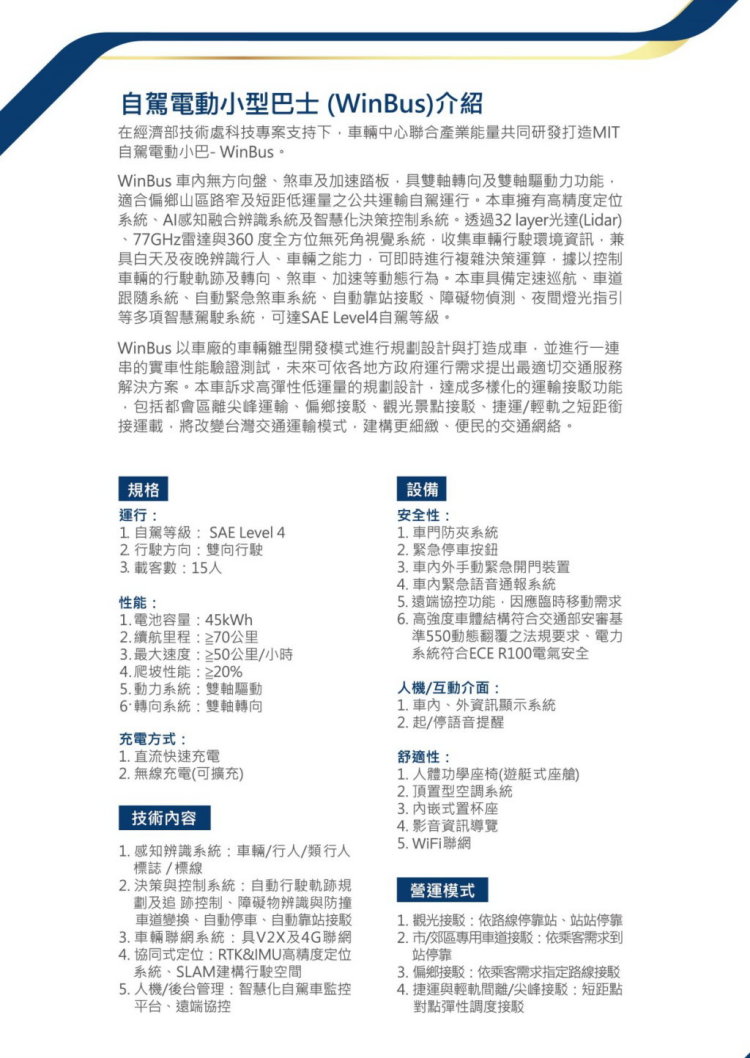 全部MIT!台灣研發製造WinBus自駕小巴全球首發! CVNews 商業車誌: 盧佛青|08/26/2019 (左起)勤崴國際柯應鴻董事長、經濟部技術處羅達生處長、交通部祁文中次長、經濟部沈榮津部長、財團法人車輛測試中心黃隆洲董事長、中華電信行動數據分公司陳明仕總經理一同揭開WinBus全台第一台自駕電動小型巴士。 從之前科技部委託ARTC經營的國內首座自駕車測試場地落成起,真正由台灣完全自主研發的自駕小巴WinBus,日前在經濟部正式與國人見面,這項計劃由經濟部技術處科技專案支持,財團法人車輛研究測試中心(簡稱ARTC、車輛中心)串連產業打造的MIT自駕電動小型巴士─WinBus,8月26日在經濟部部長沈榮津與產業貴賓們的見證下揭幕。WinBus誕生的里程碑,充分向國人證明臺灣自駕車科研人才高水準的軟實力以及臺灣產業供應鏈串連起來的國家代表隊硬實力,臺灣隊的表現絕不遜於國際大廠,足以帶領臺灣自駕車產業競逐國際舞台。 財團法人車輛測試中心與台灣自駕產業聯盟強強聯手,帶動產業新發展。 國內自駕車生態系聯手研發自製且達成Level 4標準 自駕車旋風已顛覆全球車輛與科技產業,有鑑於此科技專案陸續布局國內自駕車系統的研發;MIT自駕電動小型巴士─WinBus的自駕能力等級,已達美國汽車工程師協會(SAE)的Level 4高度自動駕駛(High Automation)階段,在固定或封閉式場域內,車輛無須人為介入,可以完成所有駕駛和環境監測功能。WinBus自駕電動小型巴士,即是集結國內車輛上下游關鍵零組件與系統,包含底盤、動力、電能、車體打造、感知、決策控制、聯網及營運服務等20家以上廠商,自研自製、從零到一,群策合力打造而出。 經濟部推動四大措施全力推動自駕車發展浪潮 在WinBus首發現場,經濟部長沈榮津表示,汽車工業從燃油車、演進到電動車,隨著影像感知產品、人工智慧技術與共享經濟發展,自駕車已為新興產業百家爭鳴之領域,全球已超過上百個城市開始無人運具試運行計畫,其中以公共運輸接駁為主的運行服務更佔近五成,顯示自駕車即將來臨。目前,臺灣各地方政府有5縣市共9個區域,有意願導入高彈性之自駕小型巴士服務模式。 而為推升自駕車浪潮,經濟部透過「建構友善法規環境」、「發展自主關鍵技術」、「發展創新運行服務模式」、「推動自駕車旗艦隊」等四大配套措施助力產業。 其中「無人載具科技創新實驗條例」也於去年12月19日經總統公布,藉由推動實驗條例,暫時排除相關法規的適用,運用地方政府場域,提供業者發展無人載具創新科技的實驗環境。從研發到產業化的過程中,必須經過實際驗證才能了解問題,對於產業經濟、系統發展及服務能量的提升將有顯著效益。另外,經濟部加大力道,將於109年補助業者推動無人載具實證運行,優先推動項目,包含有高運載(市區)、低運量高彈性(偏鄉/離峰)、物流載運、及自駕船等運行模式,歡迎業者提出申請。 其中車輛中心打造出國人自研、自製的MIT自駕電動小型巴士─WinBus,即是自駕車旗艦隊的措施之一,將發展臺灣自駕小型巴士運行創新服務模式,協助臺灣廠商形成自動駕駛系統產業生態系,促使臺灣成為全球自動駕駛系統輸出國。 WinBus全面帶動汽車產業升級 完成智慧運輸最後一哩路 車輛中心董事長黃隆洲表示,今日是個關鍵的起點,未來這自駕小型巴士身負重責大任,首先將支持政府沙盒運行政策,今年第四季將協助勤崴國際、中華電信、宏�智通為首的營運團隊提出申請,於車輛中心所在的彰濱工業區投入運行,串聯周邊觀光工廠之公共接駁運行服務;接下來也將到各場域應用,累積運行實績,最重要的是讓自駕小型巴士帶著上中下游產業鏈的期望,以次系統及創新營運服務模式,一齊輸出海外,讓我們拭目以待。 WinBus自駕車的亮相不僅展現臺灣不可小覷的研發與製造能量,在政府多年耕耘的企業升級轉型佈局裡,WinBus的出現也搶先寫下自駕車領域的重要篇章,在運用最新科技AI科技與即將到來的5G浪潮推送下,自駕車可望成為臺灣科技人才競相投入的領域與臺灣汽車產業升級的良機,建構出新的產業價值鏈,為臺灣國內上下游系統與零組件供應鏈帶來國內外新市場與經濟效益,進一步實現我國智慧運輸的願景,完成智慧運輸最後一哩路。 為迎接台灣自主研發製造自駕小巴誕生,經濟部更舉辦徵名活動不僅吸引超過00件投稿,爭相為全臺灣第一台自駕小型巴士命名,經評審決議及技術處核定「WinBus」最後奪得此殊榮,成為小型巴士正式名稱。Win取其英文原文「得勝」意涵,中文諧音「穩」則點出「穩定」的關鍵特質,因為安全穩定是全球自駕車首要追求,穩定且贏的WinBus自駕電動巴士,則是臺灣立足全球新興自駕車市場浪潮的第一步! WinBus車身線條圓潤流暢,外觀時尚現代,十分具有視覺識別性,加上可前後雙向行駛的擬人化表情車頭與俐落的黑灰色調搭配,科技感百分百,內裝設計更是以豪華遊艇乘坐舒適為目標,並結合車內外多屏顯示螢幕資訊,讓乘客與行人都能充分掌握車輛動態,成就全台第一輛完美結合科技視覺意象與自駕技術而成的智慧自駕車。WinBus的製程結合了臺灣一流廠商,精銳盡出,以全電控化、自駕化為目標,從底盤、車身、內裝設計到控制系統等一步一步從無到有精心打造,並且經過車輛中心試車場、結構強度分析、電磁相容等國際級測試環境的洗禮鍛鍊,其品質與水準完全與國際