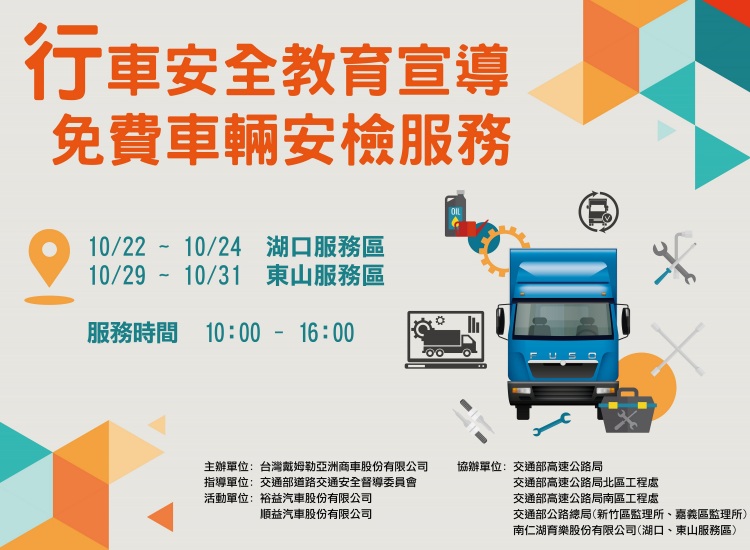 免費車輛安檢服務上路!FUSO攜手交通部,集結各方民間企業之力 CVNews 商業車誌: 編輯組|10/21/2019 由於我國高速公路的交通量逐年攀升,因此促進國家動脈的運輸效率和行車品質,提升社會大眾的交通安全意識成為首要任務,穩居商車巿場領導品牌FUSO總代理-台灣戴姆勒亞洲商車股份有限公司 (Daimler Trucks Asia Taiwan Ltd.,簡稱DTAT) 秉持著FUSO「一起運轉、深耕台灣」的品牌承諾,發起第九年度的「行車安全教育宣導及免費車輛安檢服務」活動,此活動由交通部指導且偕同民間企業共同舉辦,希望喚起更多人對交通安全議題投入更多關注和重視,也展現了「FUSO CARE」的精神,傳達FUSO在乎顧客、在乎品質、在乎台灣,希望和大家一起變得更好的信念。 這項結合政府、非營利團體和跨國企業資源共為期六天的活動,預定從十月二十二日正式上路 (分為兩批梯次10/22-10/24、10/29-10/31),從上午十點到下午四點,於國道一號上的湖口服務區,提供監理業務諮詢服務及交通安全宣導之外,以及東山服務區內,針對停留服務區的車輛,提供免費車輛安檢;項目包含胎紋、胎壓、外部燈光、廢氣排煙等項目。FUSO再三強調用路人對車輛之簡易維護的概念,讓車子能保持在最佳狀態中行駛。 除此之外,由於駕駛人開車行駛高速公路如果不小心發生擦撞,臨時需要下車查看,卻忽略國道快速車輛的危險,萬一沒有妥善處置,後果將不堪設想。為避免悲劇頻傳,FUSO也推出加碼好康做法,凡參與活動者,就有機會得到限量FUSO反光背心來防止二次事故發生,讓車主能夠安心駕駛、降低二次事故的危險。 FUSO一直以來在各地從事社會公益活動不遺餘力,除了每年舉辦FUSO HERO League安全駕駛營外,此次舉辦「行車安全教育宣導及免費車輛安檢服務」活動,不僅集結了政府與民間合作的社會力量,更落實了「FUSO CARES 因為在乎」理念,讓每位駕駛人因為在乎責任、在乎家庭、在乎彼此,而讓自己不斷變得更好。