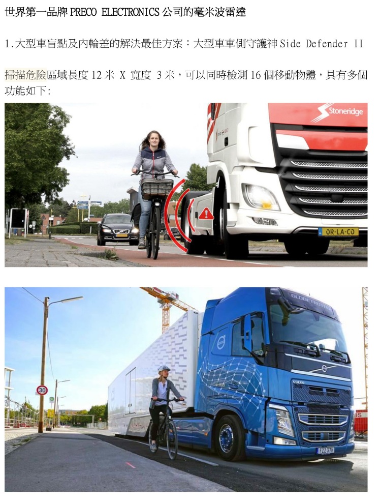 2021商業車博覽會搶先報:大型車盲點最佳解決方案—仁達汽車工程公司 CVNews 商業車誌: 編輯組|03/25/2021 「仁達汽車工程公司」將參展於4月15至4月18日,在台中國際展覽館舉行之「2021商業車博覽會」(台中市烏日區中山路三段1號)! 更多參展資訊請見: 2021商業車博覽會官網 而且,現在正在全台連鎖書店上架販售的「商業車誌27期」內,也附贈了三張「買一送一優惠券,只要憑券到大會現場,就能以優惠價購票入場! 【公司簡介】 「仁達汽車工程公司」(ZENDA AUTO) 累積30年對汽車電子的安裝及技術服務能量,是一家專業汽車電子工程的科技公司,特別專精在汽車安全專業技術方面,默默地耕耘汽車安全技術30年,重視產品及服務的品質和可靠度,不同於一般品質低劣價格便宜的業者,堅持好的產品和技術服務,才能真正保障行車安全的理念,為保護行車安全方面做出貢獻。 2019年開始代理世界第一品牌美國PRECO ELECTRONICS商用車和特種車 (危險品運輸車、混凝土車、建設機械、航空地勤設備、礦產機械、政府公共設施車輛 (電力工程車、環保車、廢棄物回收車等) 大型車的盲點和內輪差偵測毫米波雷達系統等大型車的ADAS (Advanced Driver Assistance Systems先進駕駛輔助系統),和大型車拖車的倒車無線影像系統。 2015年開始,進口德國ADAS (Advanced Driver Assistance Systems先進駕駛輔助系統) 的原廠零件、ACC (Adaptive Cruise Control 主動式車距調節巡航系統)、LDWS (Lane Departure Warning System道路偏離警示系統)、BSD (Blind Spot Detection System盲點偵測系統) 、AVM (around view monitor 360度環景系統) 等產品,做VW和SKODA及其他進口車系的安裝服務。 2010年開始,提供車載導航及娛樂系統及進口車系的介面盒安裝服務;2000年開始,提供車載音響改裝服務、1988年開始提供車載防盜系統安裝服務。 【參展產品介紹】