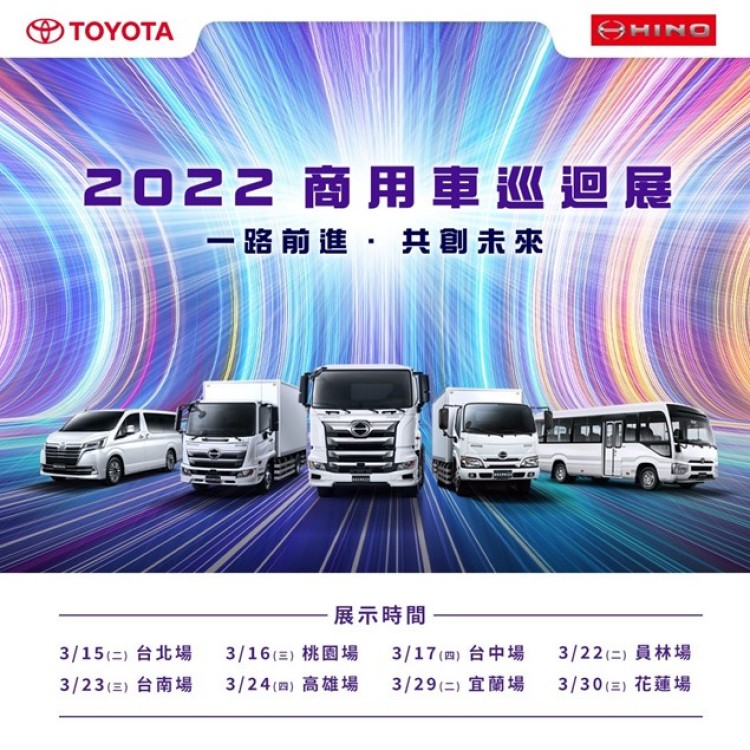 TOYOTA、HINO商用車巡迴展 3/15~3/30全台8場次起跑 CVNews 商業車誌: Davis Yang|03/14/2022 TOYOTA、HINO商用車台灣總代理和泰汽車主辦之「2022商用車巡迴展」3/15日活動開跑,於台北、桃園、台中、員林、台南、高雄、宜蘭、花蓮8場次巡迴展出,車型包含HINO多款六期安規新車以及2022全新導入的HINO 300 Hybrid、TOYOTA Coaster、TOYOTA Granvia豪華8人座車型,陣容相當完整。 回顧2021年,豐田、日野商用車甫創下來台販賣新高,以9,422台、市占率33.2%的佳績奪下台灣商用車總市場的販賣冠軍,在總代理和泰汽車持續與母廠溝通取得支援之下,2022年積極導入新車型,落實全方位(Total Support)深耕台灣的策略與各行各業一起打拼事業、共創未來。 2022年全新導入的HINO 300 Hybrid、TOYOTA Coaster中型巴士、TOYOTA Granvia 豪華8人座將透過本次巡迴展初次亮相,其中以Granvia 8人座新車最受市場矚目,全新233配置座椅及寬敞後廂行李空間,符合機場接送、包車旅遊業者需求,也滿足多代同堂家庭出遊乘坐用途,本次活動TOYOTA Granvia 豪華8人座開放預賞及預接單,預估將吸引相關業者及多人家庭的賞車熱潮。 2022商用車巡迴展採開放式入場,現場備有限量來場禮與摸彩獎項,相關資訊可洽詢和泰汽車全台所屬商用車經銷商長源汽車、蘭揚汽車、東部汽車之全台營業據點,或至HINO商用車官網最新消息查詢,或致電和泰汽車顧客服務中心0800-522-567。