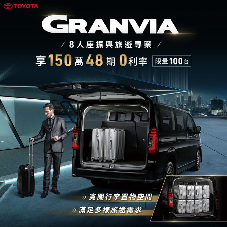 TOYOTA GRANVIA 振興旅遊專案 CVNews 商業車誌: Davis Yang|06/23/2022 因應疫情管制逐漸鬆綁,和泰汽車特別推出GRANVIA 8人座旅遊振興專案,即日起至七月底提供TOYOTA GRANVIA 8人座豪華版限量100台,150萬48期0利率購車優惠,讓消費者享有低頭款,就能輕鬆入主GRANVIA 8人座多功能豪華商旅座駕。TOYOTA GRANVIA 8人座豪華車室及寬闊行李置物空間,可以同時滿足商務、旅遊需求,深受飯店/機場接送、包車旅遊及多代同堂家庭的消費者喜愛。 購車請洽和泰汽車商用車經銷商/長源汽車、蘭揚汽車、東部汽車營業據點;亦可至TOYOTA商旅車官網(www.toyota-granvia.com.tw)查詢,或致電和泰汽車顧客專線0800-522567洽詢。 ※ 零利率專案注意事項: 1. 本優惠僅限TOYOTA GRANVIA 8人座豪華版。 2. 本優惠活動限量限時供應100台至7月底止。 3. 150萬48期0利率購車優惠指最高貸款總額150萬元,最高可分48期,經銷商及指定貸款企業保有審核之權利,且不得與其他貸款優惠專案併用。0利率購車方案之分期付款與現金付款之建議零售價相同,但實際交易價格、最高貸款總額與期數由買賣雙方各自依交易條件內容商議定之。