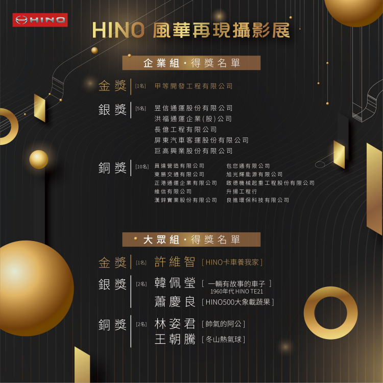 HINO風華再現攝影展圓滿結束 得獎名單公告 CVNews 商業車誌: Davis Yang|09/06/2022 和泰汽車代理的HINO商用車品牌,舉辦HINO風華再現攝影展募集活動,募集到的每件作品都是HINO與所有民眾或車主朋友們一起生活的精采故事,展現了HINO在地經營的多樣面貌以及與台灣產業一同成長的歷程。 HINO風華再現攝影展鼓勵一般民眾分享與HINO的精采故事,評審團由知名攝影師郭政彰、旅行部落客許傑、金馬導演黃信堯及兩位品牌代表組成,以他們各自的專業精選出最符合主題且具代表性的141件優秀作品。評審團表示,HINO風華再現攝影展得獎作品主題多元,從有趣、溫馨的生活細節觀察,到艱辛、勵志的創業夢想故事,展現商用車在台灣社會,無所不在的生命力。 企業組金獎由甲等開發工程有限公司獲得,將HINO形容為最貼心的終身伴侶,守護主人20年的志業;大眾組金獎由許維智獲得,主題為HINO卡車養我家,1972年一輛12噸的砂石卡車不僅是父親的謀生工具,也是全家出遊的休旅車。 為感謝所有民眾或車主踴躍參加募集活動,和泰汽車預計在今年10月下旬於HINO台北、台中、高雄三處營業據點進行實體展出,邀請得獎者及有興趣的車主親臨現場觀賞展出,相關時間及地點將於HINO官方網站及HINO Taiwan Facebook粉絲專頁公告。 ※得獎名單請至HINO官網查詢:https://reurl.cc/5pd3jn