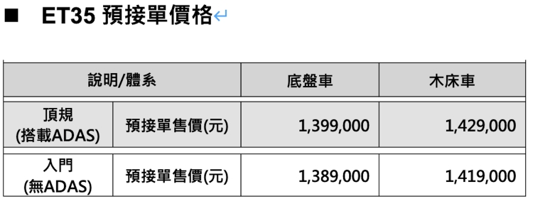 中華三菱ET35電動商用車141.9萬元開放預接單 CVNews 商業車誌: Davis Yang|09/09/2025 修正條文正式公告,汰舊換新補助於7日正式實施,即日起2,000cc以下新車可享5萬元貨物稅減徵,汰換十年以上老車再獲5萬元優惠,趕在貨物稅補助上路第一時間,中華三菱響應政策,除推出各車型優惠活動,更同步宣布,國內首款 3.5 噸純電商用車 ET35 正式開放預接,純電木床車售價141.9萬起。ET35為台灣首台量產的3.5噸電動商用車,並領先3.5噸車型同級車款,搭載LEVEL 2 ADAS先進駕駛輔助系統,提升行駛安全。為滿足客戶的使用需求,ET35提供木床與底盤車型,且分別加價一萬元,即可升級為ADAS車型,強化動力與安全,滿足企業在安全性、智慧化及低碳運輸上的全方位需求。 ET35 以純電驅動為核心兼顧節能效益,為企業打造低碳排放的綠色運輸方案。車型選擇包含木床車型,3,362mm長貨台設計,兼具載貨及運輸效率。另提供底盤車型,能進行多樣化車身打造,充分展現商用車的實用與運輸效率。ET35搭載領先同級的LEVEL 2 ADAS先進駕駛輔助系統,包含附行人偵測的FCM主動式智慧煞車輔助、全速域的ACC主動車距控制巡航系統、LKA車道維持輔助,能大幅提升行車安全性,降低事故發生機率。讓每一次的安全行駛就是賺錢的機會。ET35搭載76.5度的磷酸鋰鐵電池,NEDC測試續航里程達360公里,並支援 CCS1 快充,充電20%至80%僅需35分鐘,能迅速補充電量,告別里程焦慮。 ET35有著全新的外觀及內裝設計,搭載LED頭燈、駕駛艙採用連通式設計、10.25吋數位儀錶、EPB電子式駐煞車、搭載「智慧車聯系統」(IOT),輕鬆結合「智慧車聯系統」功能與車主專屬Car Life APP,可及時獲得車輛資訊,實現遠端控制功能,同時亦可進行預約充電。商用車創新的科技及安全式樣設定,讓全新的純電ET35提供客戶電動化、智慧化、科技化的低碳運輸新選擇。 ET35 採用在地化的零組件開發,國產自製比率超過九成,結合台灣供應鏈資源,不僅確保零件供應穩定,隨著電動車時代逐步來臨,中華三菱全台118間中華三菱服務廠也同步升級,皆具備電動車保養維修能力,讓企業用得更放心。為回饋率先響應綠色運輸轉型的客戶,提供給消費者全新電動貨車使用體驗,即刻入主ET35除享市價20,000元配件金外,當月領牌再享早鳥好禮「動力電池8年或20萬延長保固」 !誠摯地邀請消費者進行預約試乘,詳情請洽全台中華三菱展示中心!