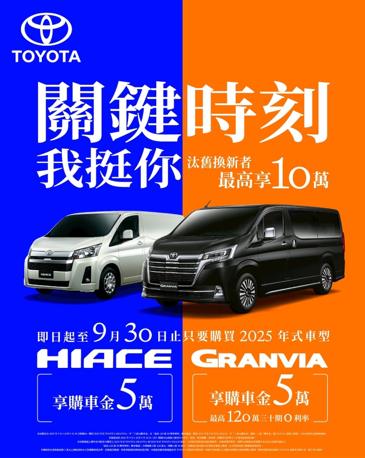 TOYOTA商旅車「關鍵時刻我挺你」限時優惠開跑 CVNews 商業車誌: Davis Yang|09/16/2025 為感謝消費者長期的支持與信任,並積極響應政府汰舊換新貨物稅減徵補助政策,TOYOTA商旅車本月推出超強「關鍵時刻我挺你」購車優惠活動,即日起至9月30日止,購買TOYOTA GRANVIA即享「5萬元購車金」及「最高120萬30期零利率」購車優惠;購買TOYOTA HIACE即享「5萬元購車金」,以最實在的優惠回饋消費者,誠摯邀請您把握最佳購車良機,輕鬆入主TOYOTA商旅車優質車款。 TOYOTA GRANVIA以霸氣鍍鉻飾條、大器頭燈與高質感座艙,展現豪華商旅的非凡格局;動力方面,搭載2.8L 1GD-FTV直列4缸柴油渦輪增壓引擎,加上6速手自排變速箱,動能蒼勁有力,換檔品質綿密平順,最大馬力176.8PS,引擎轉速1,600~2,400即可輸出45.9kg-m最大扭力,創造更暢快的駕馭感受與絕佳的油耗表現。此外,GRANVIA擁有最小5.5M迴轉半徑,不管是山區彎道、市區街道迴轉及路邊停車皆能靈活操控。 TOYOTA HIACE外觀俐落霸氣,搭載2.8L 1GD-FTV直列4缸柴油渦輪增壓引擎,搭配6速手自排變速箱,最大馬力176.8PS,引擎轉速1,600~2,400即可輸出45.9kg-m最大扭力,動能遒勁暢快前行。HIACE擁有寬敞載貨空間,配備對開式尾門及上掀式尾門兩種車型,滿足不同地形環境裝卸貨物需求。此外,具備傑出載重實力,可載重1.1噸以上,超小5.5M迴轉半徑,靈活穿梭城市街道與走訪鄉野小路,為您盡情拓展生意版圖。 TOYOTA商旅車「關鍵時刻我挺你」限時優惠活動即刻開跑,購車請洽和泰汽車商用車經銷商-長源汽車、蘭揚汽車、東部汽車營業據點;亦可至TOYOTA商旅車官網(https://www.toyotacv.com.tw/)查詢,或致電和泰汽車顧客專線0800-522-567洽詢。和泰汽車保留以上活動內容變更及最終解釋之權利,變更或修改訊息將於TOYOTA商旅車官網公布,恕不另行通知。