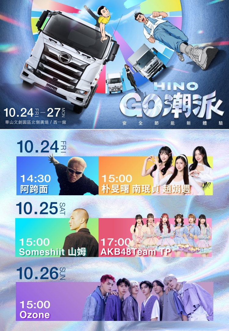 貨卡有你想不到的科技與潮味,HINO打造融合行車安全節能環保與潮流派對的大車嘉年華 CVNews 商業車誌: 趙惠群|10/27/2025 你可能陌生的貨卡車,其實暗藏著讓人驚奇的安全智慧科技和永續環保先進技術,還有你意想不到的潮味。HINO 身為商用車市場領導品牌,致力提供更安全、智能的車款與駕駛體驗,陪伴各行各業頭家車主一起打拼運轉台灣。為提升大眾對商用車的認識,擴大傳遞行車安全正確觀念,今年特別舉辦「HINO GO 潮派-安全節能新體驗」活動,10/24至27日於台北華山文創園區西一館盛大登場,打造融合「行車安全X節能環保X大車文化」兼具教育與趣味的大車嘉年華。 HINO「行車安全X節能環保X大車文化」活動亮點包含「戶外展車安全展演-大車視野盲區、省油安駕挑戰賽」及「室內日野大道沉浸式特展」,車商現場更邀請人氣潮流卡司:嘻哈歌手阿跨面,以及包含南벡貞、趙娟週、朴旻曙在內的 韓籍啦啦隊,加上AKB48 TP、山姆、Ozone、原夢代表隊合唱團,現場接力開場,車商特邀 HINO 車主及所有民眾共同參與,感受潮好玩的大車文化魅力。 《日野街頭安全展演》體驗大車視野盲區,參加省油安駕挑戰賽,萬元獎金等你來拿! 本次 HINO 將整體展區打造成熟悉的城市場景,邀請民眾走進潮流的日野大道,透過大車駕駛體驗與多元展演,讓民眾重新認識在日常生活周遭的商用車。於華山北側戶外廣場,HINO 特別打造兼具安全與節能的體驗場域,除了可近距離觀賞配備六期安規 HINO 各系列車型,民眾更可以親自登上 HINO 700 系駕駛座,感受大車司機「視野死角與地面風險盲區」。同時,本次更特別舉辦「HINO 省油安駕挑戰賽」,邀請車主與民眾報名參賽,駕駛指定路線評測油耗表現。活動設有豐富獎品,包含省油完賽獎「HINO GO 潮傘」、省油達標獎「HINO 700系模型車」,總排名前三名更可獲得「最高 3 萬元現金獎勵」,邀請您踴躍報名挑戰,角逐省油達人榮耀。此外,HINO 更將 500 系鷗翼車廂改造成「行動電競房」,民眾可上車連線對戰任天堂 Switch 2 瑪利歐賽車遊戲,展現 HINO 車輛的多元空間應用。 《日野大道潮流文化特展》從品牌進化史進入 VR 安駕模擬艙,化身大車人生漫畫角色,欣賞舊車再生藝術,全方位沉浸體驗大車潮流文化! 在華山文創園區西一館內,HINO 打造了「日野大道」沉浸式展覽,結合多元互動與品牌故事,引領民眾走進大車文化的潮流宇宙。展區涵蓋多項亮點,包括「日野大車誌」以盒玩牆面呈現 HINO 車款進化史、「日野大有料」透過 VR 模擬器體驗先進安全科技、「日野漫畫屋」以巨幅漫畫和廣播帶您走入大車司機的趣味日常,以及「日野大戲院」播映 HINO 創意打造家、品牌與車主故事系列影集。同時「日野有潮市」與藝術家合作,將汽車廢棄零件回收,再生創作為藝術展品與實用皮件用品,展現永續再生的創意巧思。透過大車潮流文化特展體驗,讓大眾感受 HINO商用車推動社會前行的正向影響力。 《潮流舞台派對》阿跨面、韓籍啦啦隊(南벡貞、趙娟週、朴旻曙)、山姆、AKB48 Team TP、Ozone 接力開唱 活動期間每日邀請重量級藝人及人氣女團輪番上陣,帶來潮流音樂與舞台互動演出。10/24(五)開幕日邀請嘻哈歌手-阿跨面與韓籍啦啦隊-南벡貞、趙娟週、朴旻曙熱情應援,10/25(六)由金曲最佳新人-山姆及活力偶像女團-AKB48 Team TP 接力演出,10/26(日)則有新生代超人氣男團-Ozone 熱力登場,10/27(一)則由原夢代表隊-新竹桃山國小合唱團帶來別具意義的泰雅天籟合唱表演,活動四日潮流舞台音浪不間斷,給您熱力滿載的大車能量! 本次活動 HINO 希望透過行車安全展演、節能安駕挑戰與大車文化體驗,以最潮流、趣味的方式,拉近商用車與大眾的距離,體會商用車與所有人日常生活的緊密連結,以實際行動推動更安全、節能的商用車運輸新未來。誠摯邀請所有 HINO 車主與民眾於 10/24 至 10/27 走進台北華山,共同參與這場不容錯過的年度大車文化盛典。 《HINO GO 潮派-安全節能新體驗》活動資訊 活動日期:2025/10/24(五) 14:00~19:00、2025/10/25(六)~10/27(一) 11:00~19:00 活動地點:台北華山文創園區西一館 (台北市中正區八德路一段 1 號) 活動對象:HINO 車主及所有民眾皆可免費入場參觀